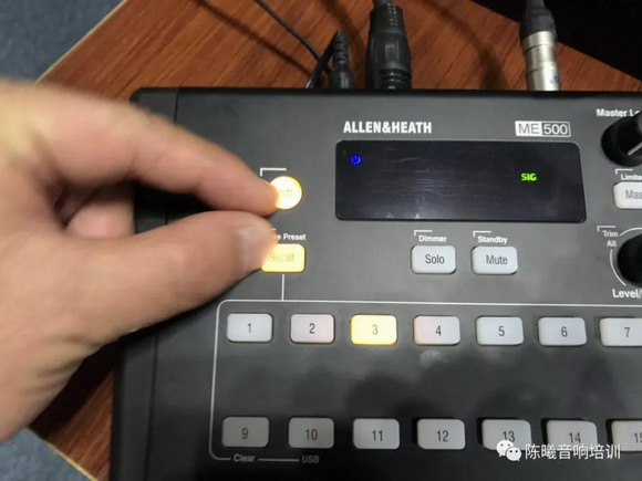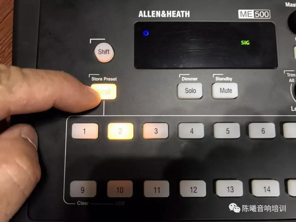 需要调出已经保存场景,按下Recall键后,按亮一个数字键,就调出之前保存在这个位置上的场景了。