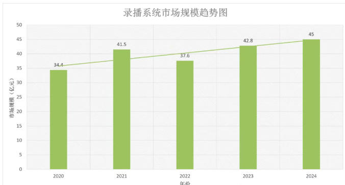根据中研普华产业研究院发布的录播行业发展报告,2020 - 2023年受特殊情况影响,线上教育需求呈爆发式增长,其中2023年教育录播市场规模达到顶点,当年增长5.7%,市场规模接近45亿元;从2024年开始,教育录播市场受制于财政支出、教育转向、技术发展等因素,传统录播行业逐渐下行。