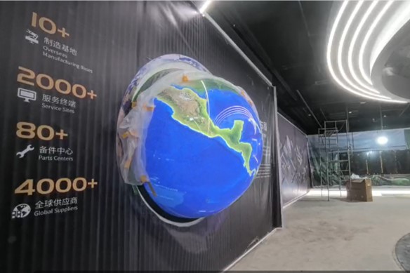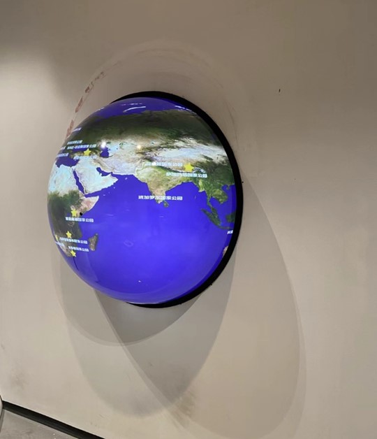 徐工集团新的数字多媒体展厅,为了实现徐工集团的全球化销售网络布局,采用喜宝视150公分内投球幕产品,配置触摸互动软件硬件系统实现了在球体上可以实时转动球体、触摸点击总部及各个大洲的分支机构等,相关对应的情况文字介绍\图片\视频等可以同步弹出播放。可以让操作人员和参观领导实时的沉浸式体现集团全球化的规划布局、各类工程机械产品图文介绍,结合展厅其他展项更好的数字化展示集团的风采。