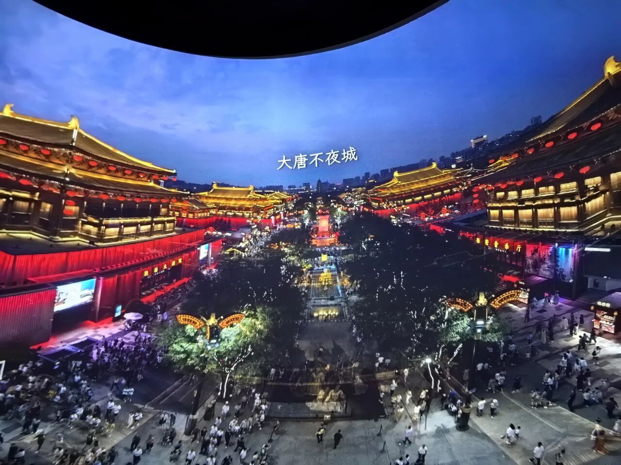 “御飞厅”中的《长安之上》飞行影院是剧院的核心体验项目,它凭借20米超巨球幕,构建出一个广阔而震撼的视觉空间,仿佛将整个盛唐盛景都囊括其中;