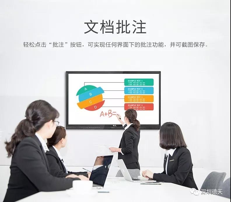 智能会议平板,旨在通过整合当下电脑以及各种显示终端和会议终端的功能打造全新的会议解决方案,最终大幅提升人们在会议、演播、教育、设计和远程控制等行业领域中的沟通效率,是信息化时代办公、教学、媒体和工程的最新优选解决方案。会议平板的主要功能1、智能流畅书写,多点灵敏触控传统会议室里的白板可书写区域太小,黑笔还总是存在断油的烦恼,可视区域太小,会议室总有一部分人看不到白板上写的是什么,费时不说还低效。德天会议平板的人机交互屏幕是采用全新红外触控技术研发而成新型触摸屏,反应十分灵敏,支持十点触控,可手写、擦拭、放大、缩小、移动内容,随时批注。 此外会议平板还可任意切换字体颜色和背景颜色,书写内容任意缩