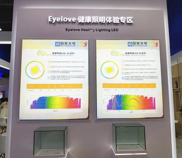 本次主要展出了Eyelove™ DL系列和EC系列。Eyelove™自然光DL系列主打类太阳光谱,减少了低波段蓝光(415-460 nm)部分,可为更高标准的灯具提供更有优势的光动力。Eyelove™健康光EC系列,主打去短波蓝光护眼功能,视觉舒适度高,更有利于眼睛健康,色温覆盖3000K-6500K,系列齐全,光效高达175lm/W。