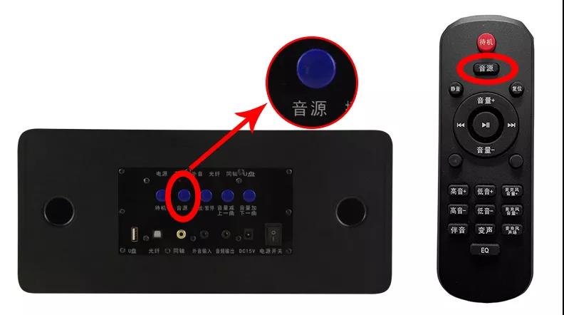 4,把麦巢音响接上电源开机,话筒安装好电池就有声音了,然后在音响背面找到音源键或者遥控器音源按钮调节音响输入源,将音响调节至外音输入模式