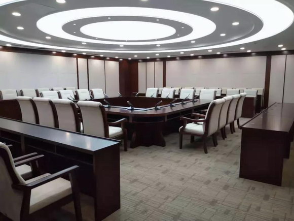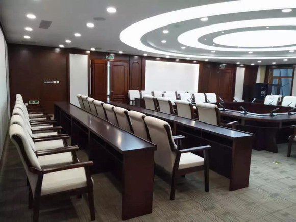 会议室设计为会议、报告、小型表演的综合场所。主要用来召开中小型会议,如新闻发布会,报告会,签字仪式,职工培训等。