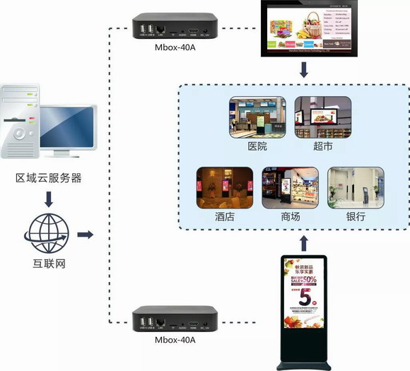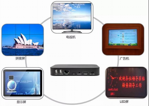 Mbox-40A可通过HDMI接口与电视机、LED屏、拼接屏等对接,实现多媒体信息发布,可广泛应用于政企服务、银行金融、医疗卫生、酒店宾馆、机场车况、商业连锁、通信、教育培训、智能楼宇、广告运营等众多行业和场所。