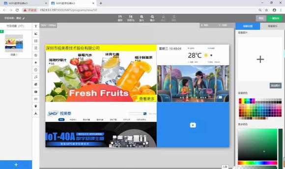 支持MIPS信息发布软件等行业主流信息发布软件,实现广告远程发布,支持视频、图片、音频、网页、文档、天气、时间、混播、直播流、HDMI IN、APK等多种节目元素,支持互动节目编辑。