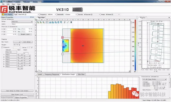 本扩声系统为了保证听众区有足够的声压级以及语言清晰度,主扩扬声器采用了(VK310+VK310S)三分频三驱动的线阵列扬声器组合,地面超低部分使用了4只WA118单18寸超低频音箱 。
