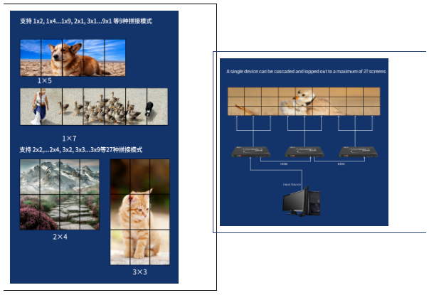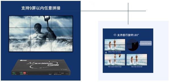 输出支持首行180°旋转,还可任意组合多种拼接模式:横屏/竖屏/田字形。