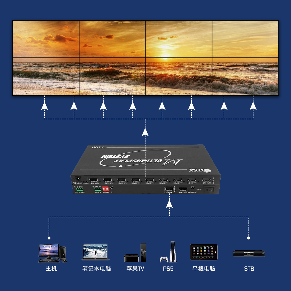 BIT-VWC-XL109拼接处理器支持一路HDMI2.0输入,九路HDMI1.3输出,一路HDMI2.0环出。
