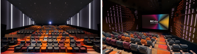 台北巨蛋秀泰影城配备 12 块由科视 Christie RGB 纯激光放映机驱动的银幕,带来震撼的观影体验(左图);此外,该影城还设有杜比视界 + 全景声影厅,为观众打造沉浸式视听盛宴(右图)